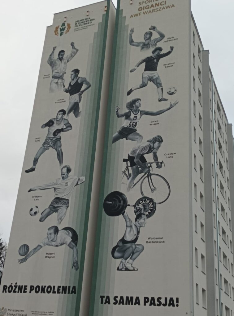 A magnificent mural has been unveiled on one of the walls of the newly renovated AWF Student House, situated nearest to Marymoncka Street. This artistic creation, which is almost visible from the office of the Polish Weightlifting Federation (PZPC), pays homage to some of the most iconic figures in Polish sports, all of whom have been associated with AWF Warsaw during their illustrious careers.