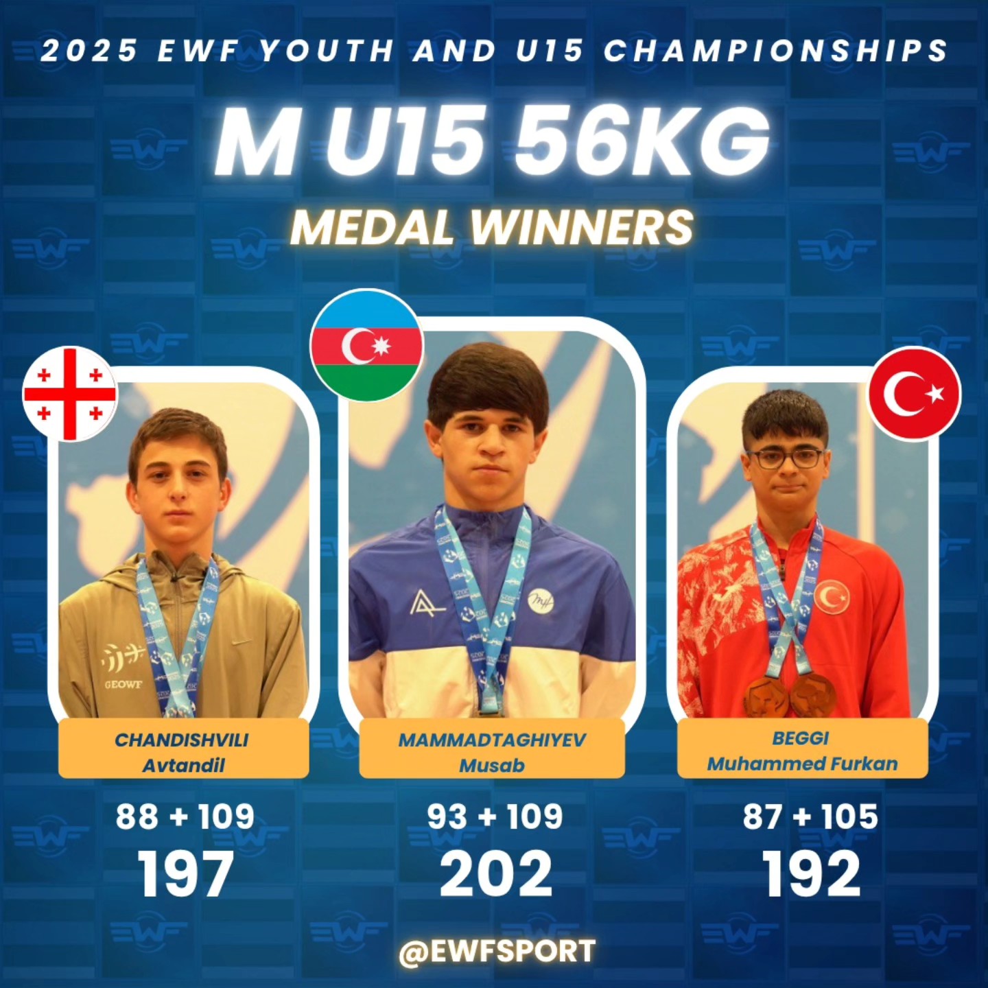 The A group of the Men’s Youth 56kg category followed with medal-winning lifts. Musab Mammadtaghiyev of Azerbaijan claimed gold with a total of 202kg (93kg snatch, 109kg clean & jerk), securing the first gold for Team Azerbaijan and adding to their proud weightlifting tradition. Georgia’s Avtandil Chandishvili took silver with 197kg (88kg snatch, 109kg clean & jerk), while Türkiye’s Muhammed Furkan Beggi earned bronze with 192kg (87kg snatch, 105kg clean & jerk).
