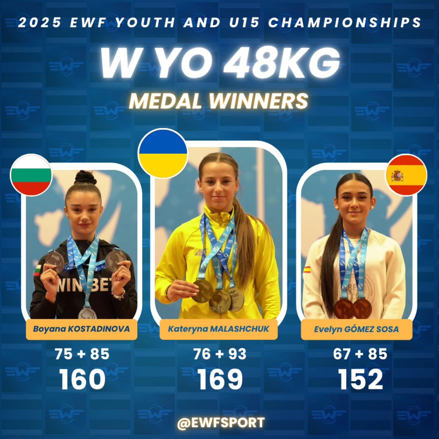 In the Women’s Youth 48kg group, Ukraine’s Kateryna Malashchuk delivered a standout performance, breaking all records in snatch, clean & jerk, and total with 76kg snatch and 93kg clean & jerk for a 169kg total. Bulgaria’s Boyana Kostadinova claimed silver with 160kg (75kg snatch, 85kg clean & jerk), and Spain’s Evelyn Gómez Sosa thrilled the home crowd by taking bronze with 152kg (67kg snatch, 85kg clean & jerk).