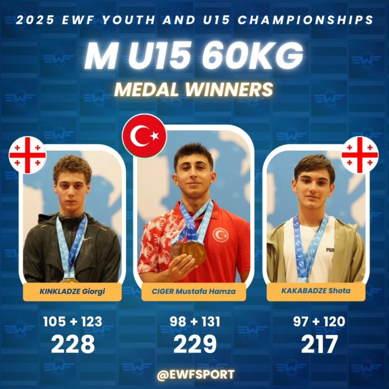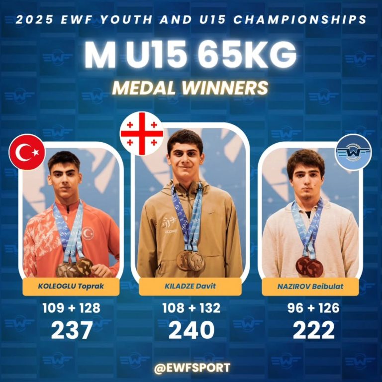 The day closed with the Men’s U15 65kg category. Georgia’s Davit Kiladze secured gold with 240kg (108kg snatch, 132kg clean & jerk). Moldova’s Toprak Koleoglu took silver with 237kg (109kg snatch, 128kg clean & jerk). Bronze went to Beibulat Nazirov (AIN) with 222kg (96kg snatch, 126kg clean & jerk).
