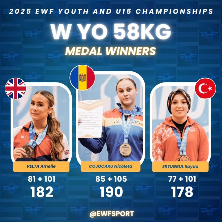 It was a proud moment for Moldova as Nicoleta Cojocaru dominated the Youth Women’s 58kg category. She lifted 85kg in snatch and set a new European Youth Record with 105kg in clean & jerk, finishing with another European Youth Record total of 190kg. Great lifts from her kept the hall on its feet. Amelie Pelta of Great Britain earned silver with 182kg (81kg snatch, 101kg clean & jerk), while Türkiye’s Ilayda Ertugrul took bronze with 178kg (77kg snatch, 101kg clean & jerk).