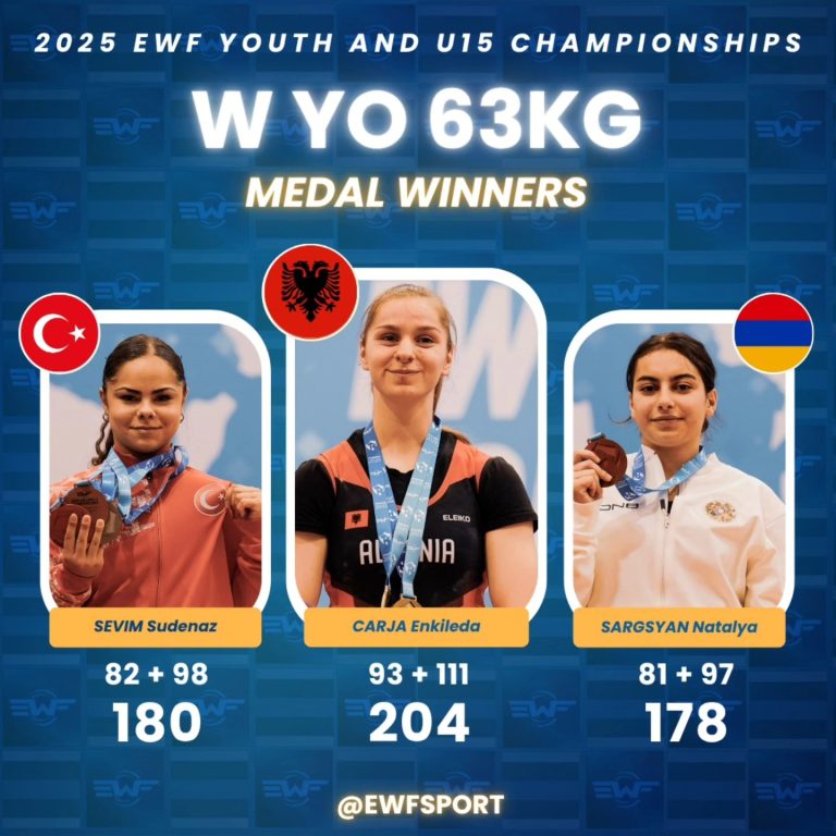 In the Youth Women’s 63kg category, Albania’s Carja Enkileda was in a class of her own. She broke three European Youth Records – 93kg snatch, 111kg clean & jerk and a 204kg total. Carja has been building a reputation with consistent strong results, and today’s lifts confirmed her as a true rising star on not just Europe but World level.