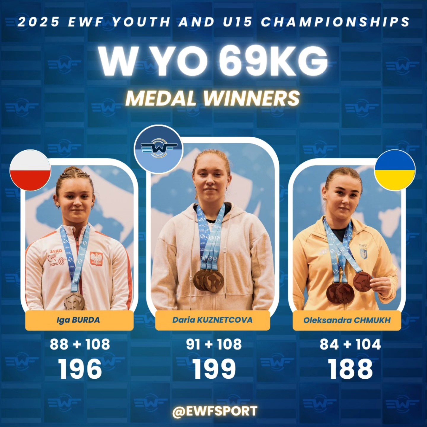 In the Women’s Youth 69kg group, Daria Kuznetcova (AIN) won gold with a total of 199kg (91kg snatch and 108kg clean & jerk). Iga Burda of Poland earned silver with 196kg (88kg snatch, 108kg clean & jerk), while Oleksandra Chmukh of Ukraine took bronze with 188kg (84kg snatch, 104kg clean & jerk).
