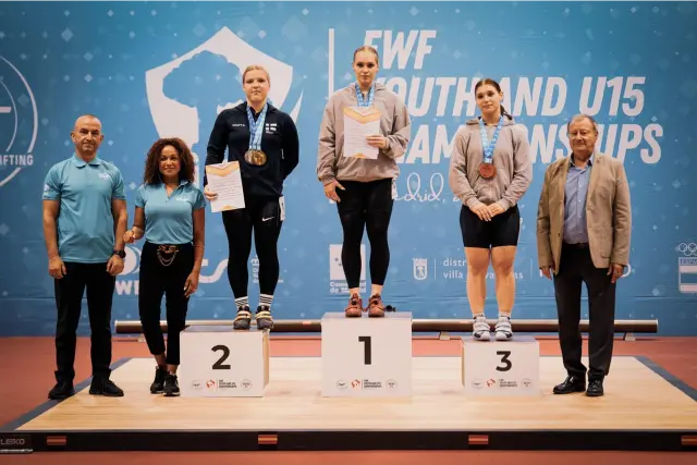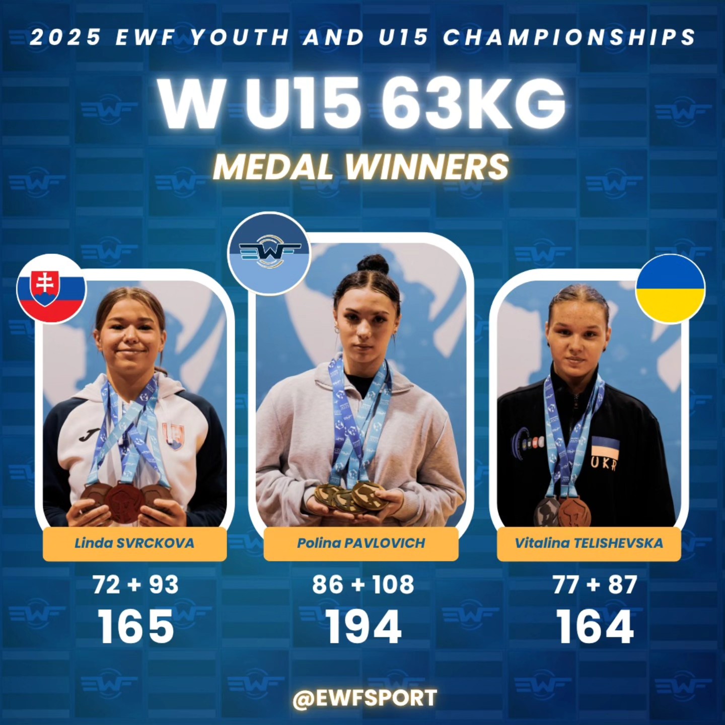 The day ended with the U15 Women’s 63kg final. Polina Pavlovich (AIN) secured gold with a total of 194kg (86kg snatch, 108kg clean & jerk). Linda Švrčková from Slovakia claimed silver with 165kg (72kg snatch, 93kg clean & jerk), and Ukraine’s Vitalina Telishevska earned bronze with 164kg (77kg snatch, 87kg clean & jerk).