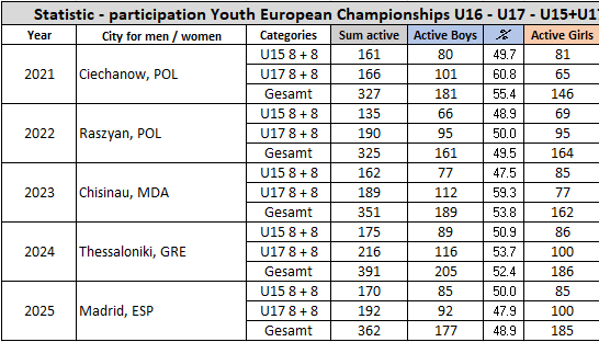 After only boys competed in 1992 and 1993, girls joined in 1994 in Ljubljana. There were 8 categories for boys and categories for girls. From 1995 to 2000, there were 9 plus 7 categories. In 2000, when weightlifting for women became an Olympic sport, there could only be a total of 15 categories (8 male, 7 female). The total number of participants approached the 220 mark in absolute terms. The percentage of girls increased from around 30% at the beginning to around 40%. In 2003, the age limit was raised to 17. Ten years later, in 2013, it was recognised that the youngest athletes also needed their international debut. The U15 age group was introduced, marking another milestone in the development of the sport. This format has remained in place until today, 2025. The percentage of young female starters has levelled off at around 50% of the total field.
